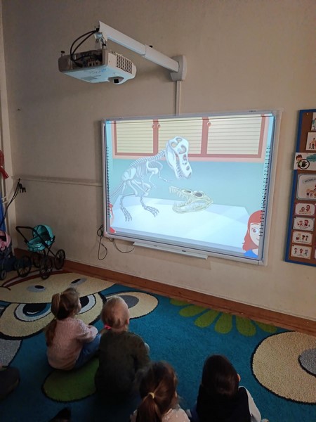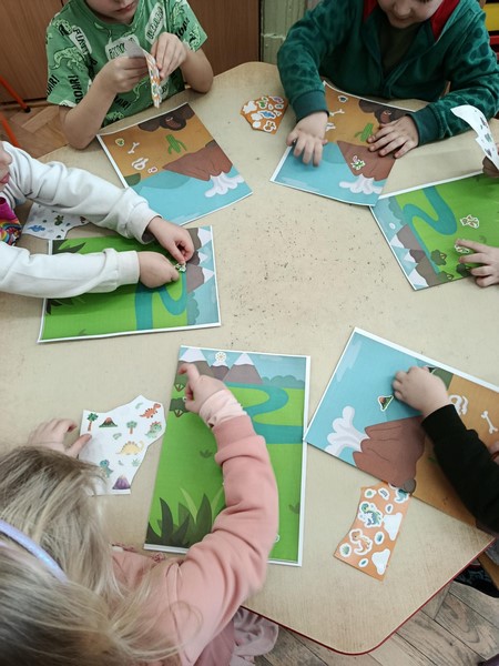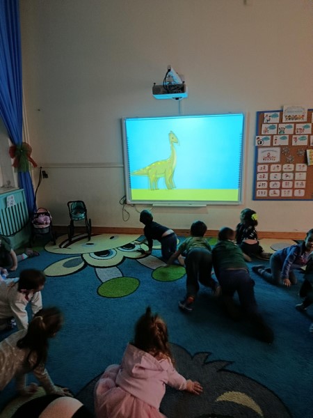 Dzieci wzięły udział w zabawie ruchowej przy muzyce, naśladując sposób poruszania się dinozaurów – było tupanie, skradające się kroki i „ryki”, które wywołały wiele uśmiechów. Następnie obejrzeliśmy krótki film edukacyjny, dzięki któremu przedszkolaki mogły poznać wygląd oraz zwyczaje tych niezwykłych stworzeń.
